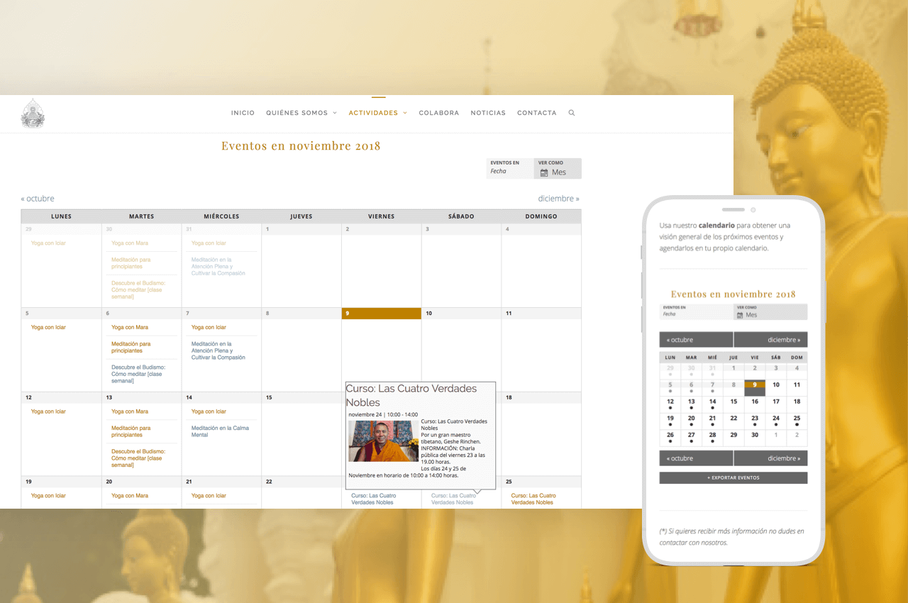 Diseño Web para Nagarjuna Campo de Gibraltar que fomenta el estudio, pero debidamente complementado por la meditación mediante actividades, clases semanales, talleres y retiros. El objetivo del centro es preservar la filosofía, psicología y práctica de la tradición budista Mahayana, su coordinador: Javier González y la coordinadora espiritual: Sofía Marbán.